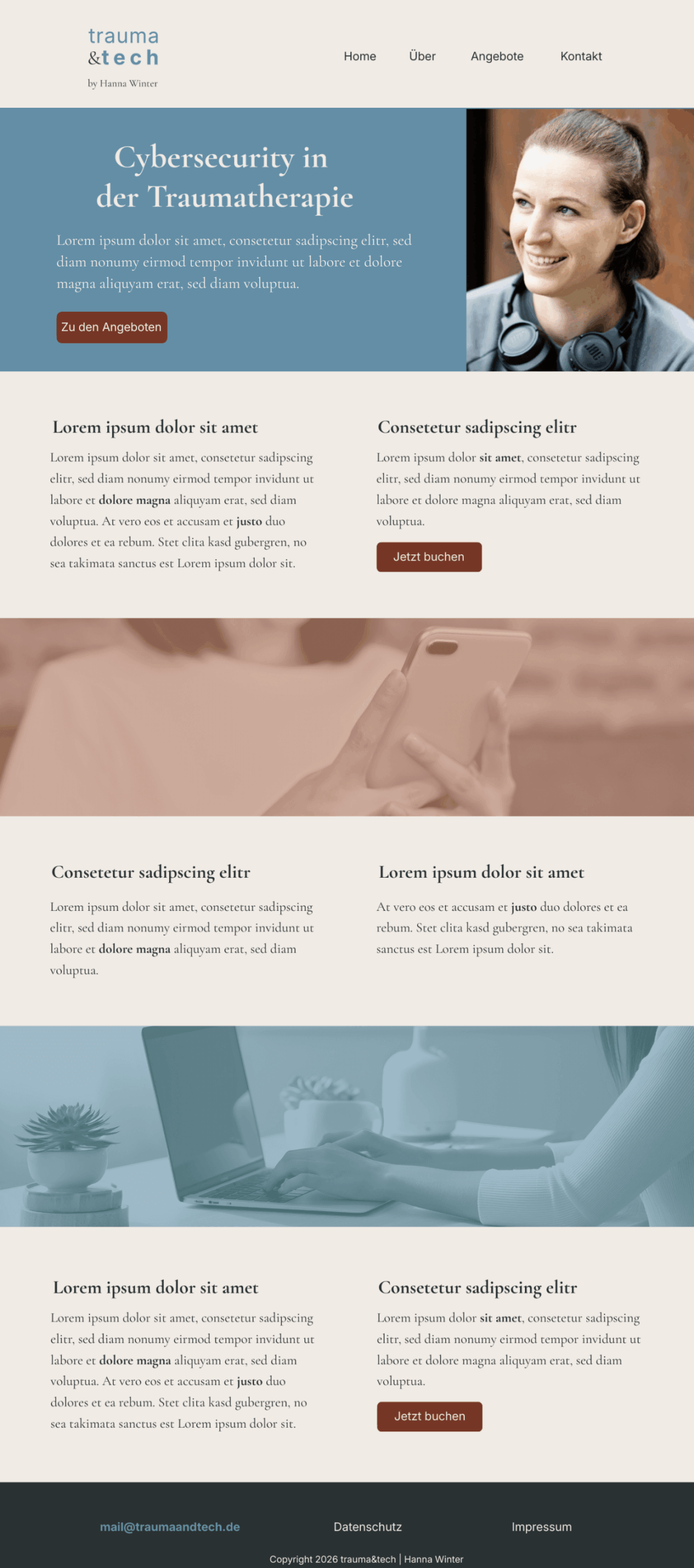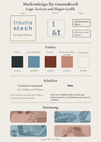 Für trauma&tech habe ich ein komplettes Markendesign inklusive Logo sowie einen Webdesign-Entwurf für die Startseite entwickelt, der als Grundlage für die eigene Umsetzung durch die Kundin diente.